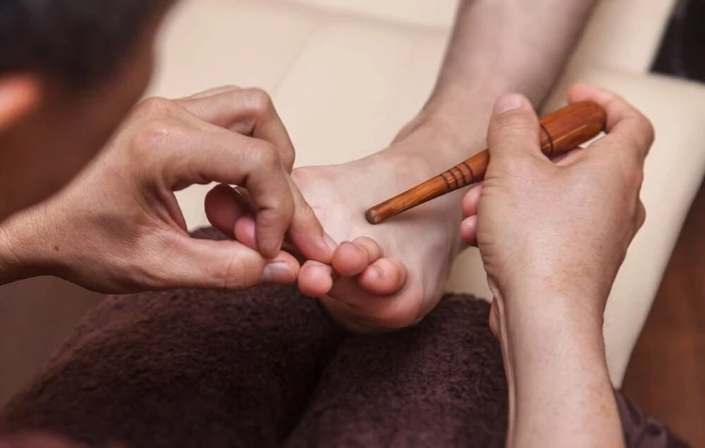 Тайський масаж стоп фокусується на рефлекторних точках підошви, які за принципами тайської медицини пов’язані з внутрішніми органами. Техніка передбачає роботу дерев’яною паличкою, що створює точковий тиск, покращуючи кровообіг і знімаючи втому після тривалого стояння чи ходіння.